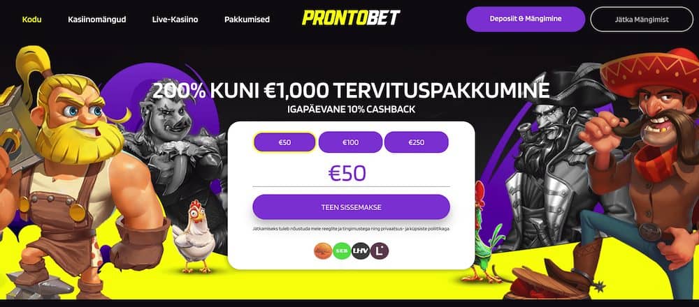 ProntoBet on Eesti kontovaba online kasiino, kus nautida hasartmÀnge otse panga kaudu sisselogimisel, ilma kontot avamata! Innovaatilise kasiino nautimiseks saad kohe esimesel sissemaksel kasiino poolt 200% tervitusboonust kuni 1000 ⏠ulatuses.